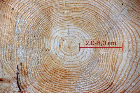 * Antalet årsringar bestäms i intervallet 2–8 cm från märgen i stockens grovända. För rotstock av gran görs bestämningen i stockens toppända. Bestämningen baseras på den radiella riktning som ger minsta antalet årsringar.